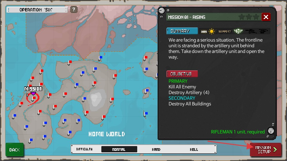 在任務選擇界面查看任務詳情后,點擊【MISSIONSETUP】按鈕進入任務準備環節,即可啟動游戲任務。