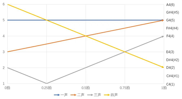 1、首先,我們得熟知五度標記法,陰為第一聲,陽為第二聲,上為第三聲,去為第四聲。在這里,五度是相對的,并沒有固定音調,五度間也沒有絕對確定的音程。但在ACE里,如果要調念白的情況下,五度間相隔的音程最好為一個全音,并且第四聲也最好在原來的基礎上往上移兩個半音。