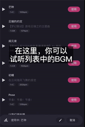 2、在這個頁面可以自由挑選喜歡的BGM,然后點擊使用來進行更換。