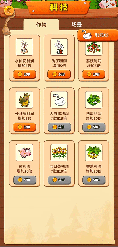 5、每個作物的產量不同,優先升級產量高作物的科技、產量、也就是從最貴的開始升級,然后把科技那一頁全部拉平均升級,不要一個瘋狂升級,這樣只會浪費金幣。