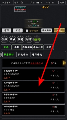 2、進入福利專區,完成諸如伙伴突破第一章等特定任務,達成目標后可以獲得仙緣招募令、仙緣等獎勵,從而促進角色與伙伴的成長進程。