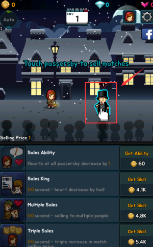 4點擊紅框中的紳士角色,向過路的人推銷火柴以獲得金幣。