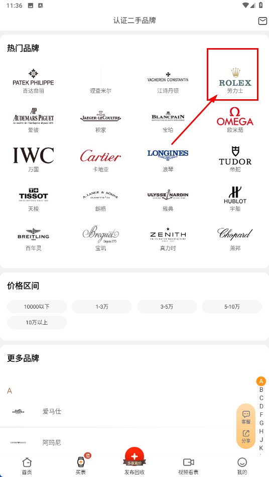 點擊底部的【買表-功能按鈕】,即可進入認證二手品牌的選擇頁面。