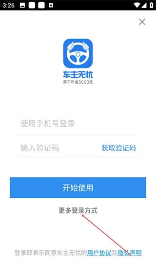 進入【車主無憂】的登錄界面后,你可以選擇用手機號加驗證碼的方式登錄,要是想換其他登錄渠道,點擊【更多登錄方式】就行。