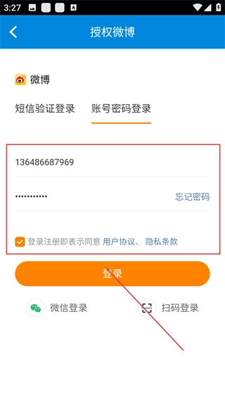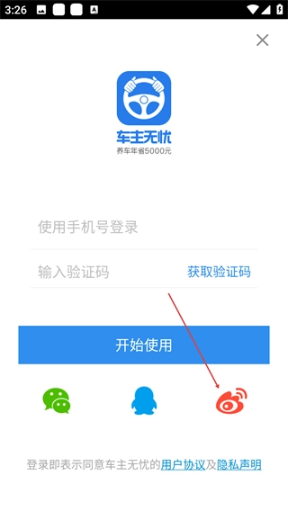在微博的賬號密碼登錄頁面,輸入手機號和密碼,勾選相關協議后點擊【登錄】按鈕,完成授權就能進入【車主無憂】應用。
