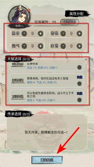 在角色創建界面完成屬性與天賦的配置后,點擊紅色箭頭所指向的重生輪回按鈕,以此確認初始配置對應的修仙劇情流程。