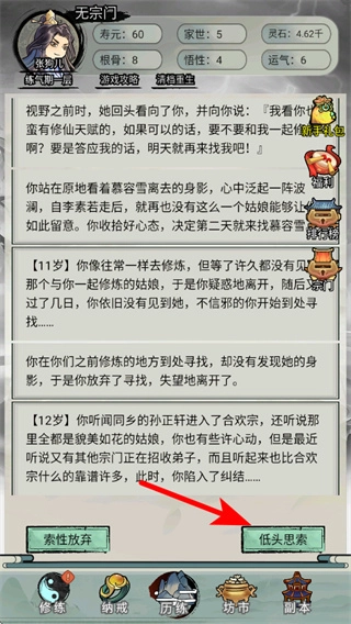 在劇情選擇界面,點擊紅色箭頭所指的低頭思索按鈕,選中該劇情選項,以此推動與慕容雪相關的劇情進展。
