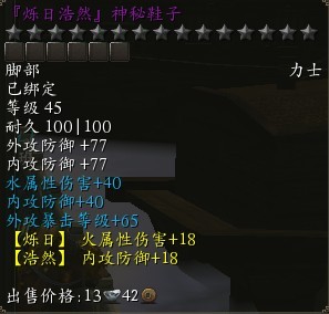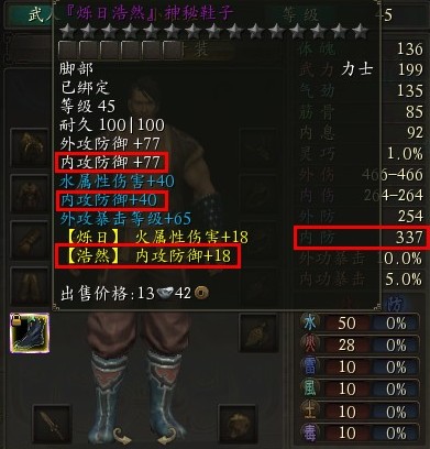 在神秘鞋子的屬性項中,除了白色的裝備基礎(chǔ)屬性外,另有強化獲得的黃色屬性附帶“【浩然】內(nèi)攻防御+18”的強化屬性。