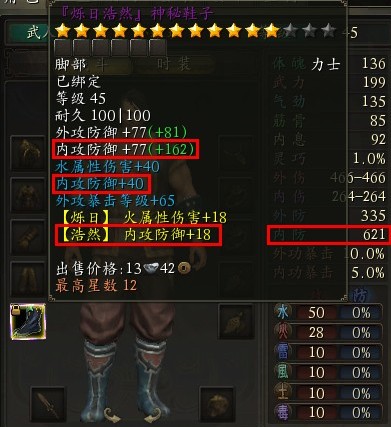 (有人會問2.1倍的升星效果是怎么得出的,最簡單的方法就是,你可以用升星后獲得的加成屬性值除以原有基礎(chǔ)屬性,即可得出:裝備基礎(chǔ)內(nèi)攻防御升星加成屬性值 162 ÷ 裝備基礎(chǔ)內(nèi)攻防御原有屬性值 77 = 12星加成效果 2.1)