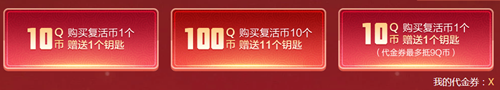 10Q幣購買復活幣1個可獲得1個鑰匙,100Q幣購買復活幣10個可獲得11個鑰匙,僅限掌上道聚城購買可額外獲得1個鑰匙,單Q限1次;擁有代金券的玩家,可以使用代金券抵扣購買復活幣并贈送鑰匙,一次最多抵扣9個代金券,一旦代金券使用后無法退還(下單后未支付,訂單被系統取消之后或手動取消之后會返還抵扣的代金券)