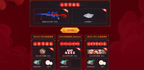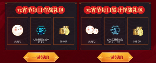 活動(dòng)期間,每日完成1場(chǎng)游戲,即可領(lǐng)取1次元宵節(jié)每日作戰(zhàn)禮包,每個(gè)QQ每日限領(lǐng)獎(jiǎng)1次。每日累計(jì)游戲30分鐘,還可領(lǐng)取元宵節(jié)每日累計(jì)作戰(zhàn)禮包,每個(gè)QQ每日限領(lǐng)獎(jiǎng)1次。